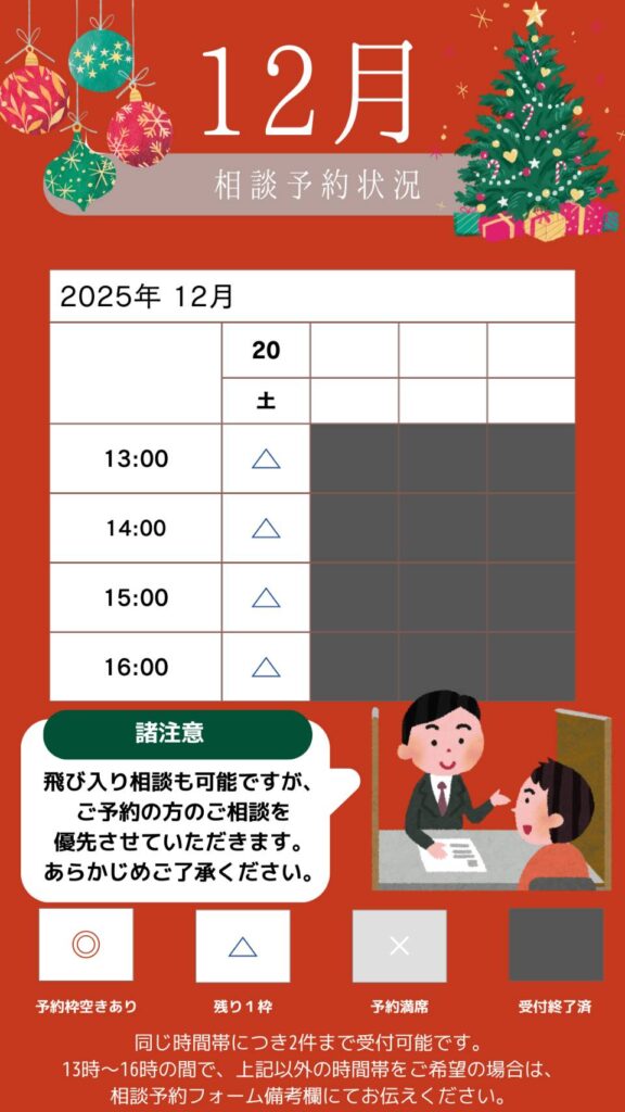 12月20日が年内最後の通常相談となります。皆様お気軽にぜひお越しください。