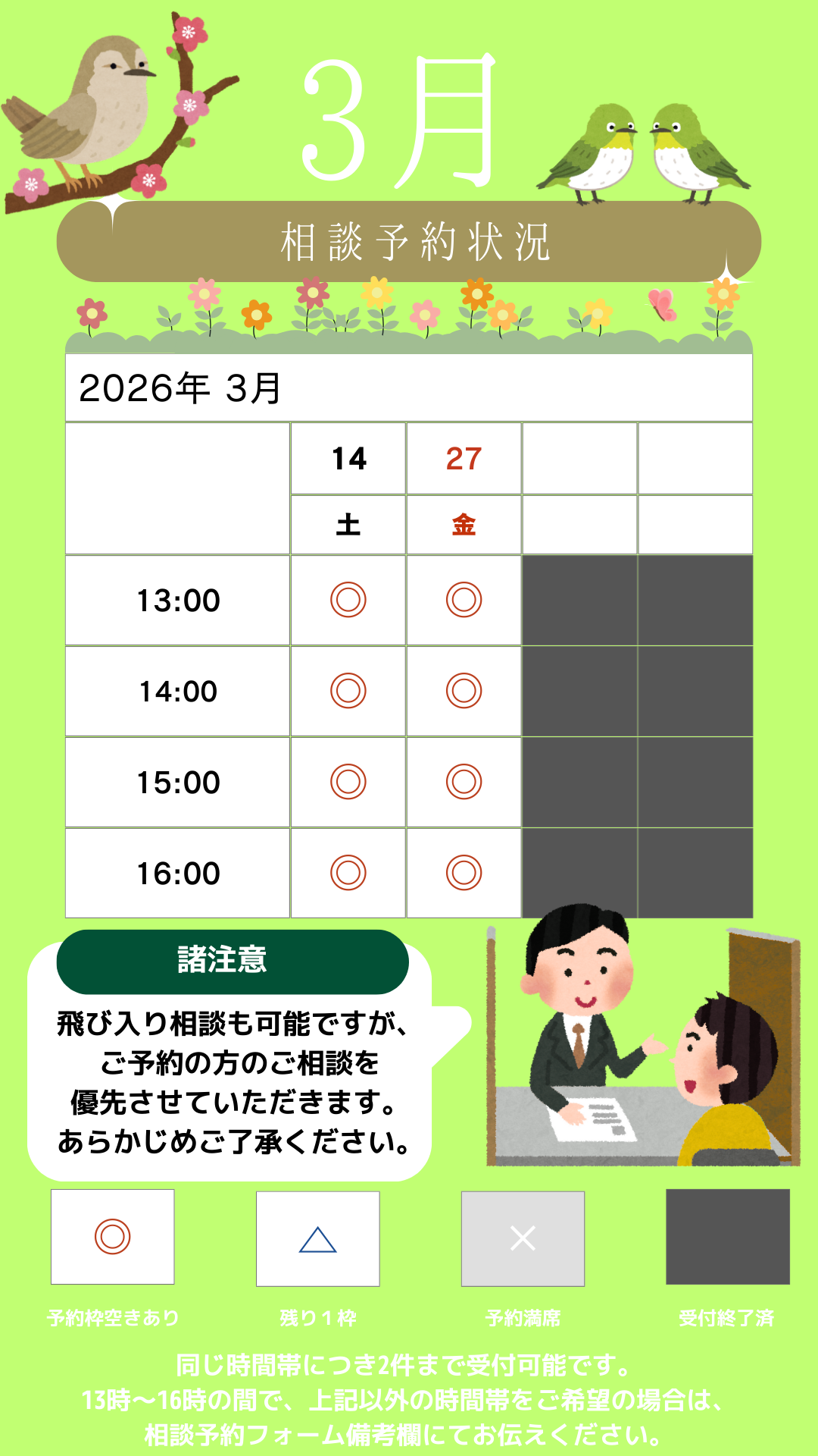 ※3月27日(金)は、静岡大学の学生さん、弁護士や教授などの先生方に弊学にお越しいただき、合同で通常相談を開催する予定です。この日のみ、「⚠️金曜日開催」となっております。あらかじめご了承ください。3月27日が年度内最終相談となっております。部員一同精一杯取り組みますので、皆様ぜひお越しくださいませ。